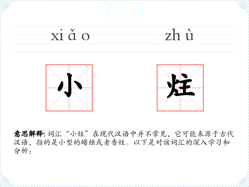 词汇“小炷”在现代汉语中并不常见,它可能来源于古代汉语,指的是小型的蜡烛或者香炷。以下是对该词汇的深入学*和分析:
