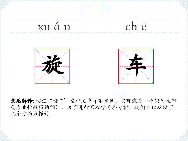 词汇“旋车”在中文中并不常见,它可能是一个较为生僻或专业性较强的词汇。为了进行深入学习和分析,我们可以从以下几个方面来探讨:
