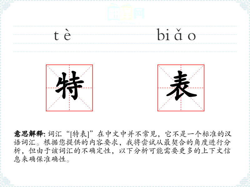 词汇“[特表]”在中文中并不常见,它不是一个标准的汉语词汇。根据您提供的内容要求,我将尝试从最契合的角度进行分析,但由于该词汇的不确定性,以下分析可能需要更多的上下文信息来确保准确性。
