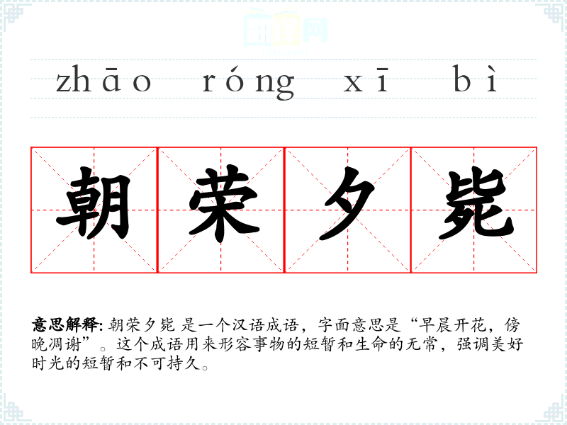 在西方文化中,类似的表达可能是“Flowers that bloom and fade”,虽然不如“朝荣夕毙”那样简洁和富有诗意,但也传达了相似的意义。