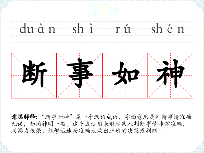 “断事如神”是一个汉语成语,字面意思是判断事情准确无误,如同神明一般。这个成语用来形容某人判断事情非常准确,洞察力极强,能够迅速而准确地做出正确的决策或判断。
