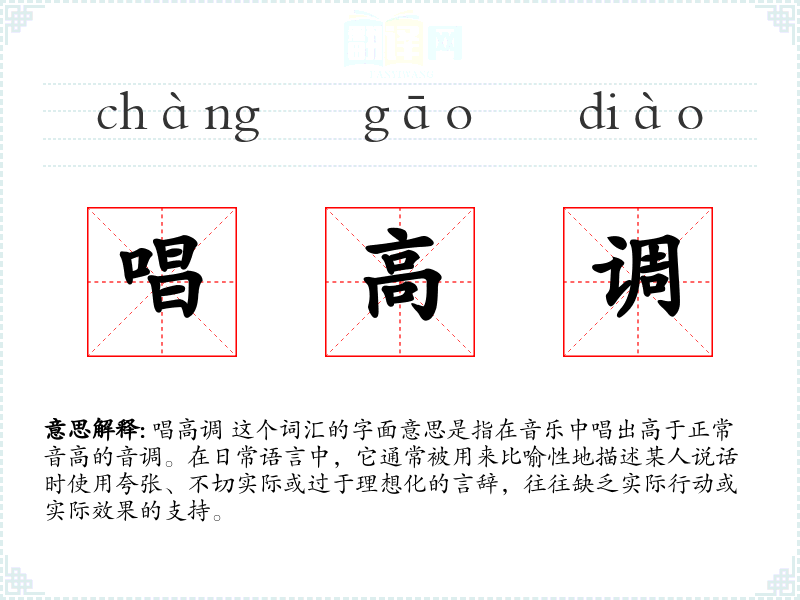 唱高调 这个词汇的字面意思是指在音乐中唱出高于正常音高的音调。在日常语言中,它通常被用来比喻性地描述某人说话时使用夸张、不切实际或过于理想化的言辞,往往缺乏实际行动或实际效果的支持。