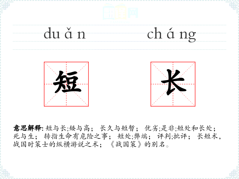 短与长;矮与高; 长久与短暂; 优劣;是非;短处和长处; 死与生; 转指生命有危险之事; 短处;弊端; 评判;批评; 长短术,战国时策士的纵横游说之术; 《战国策》的别名。
