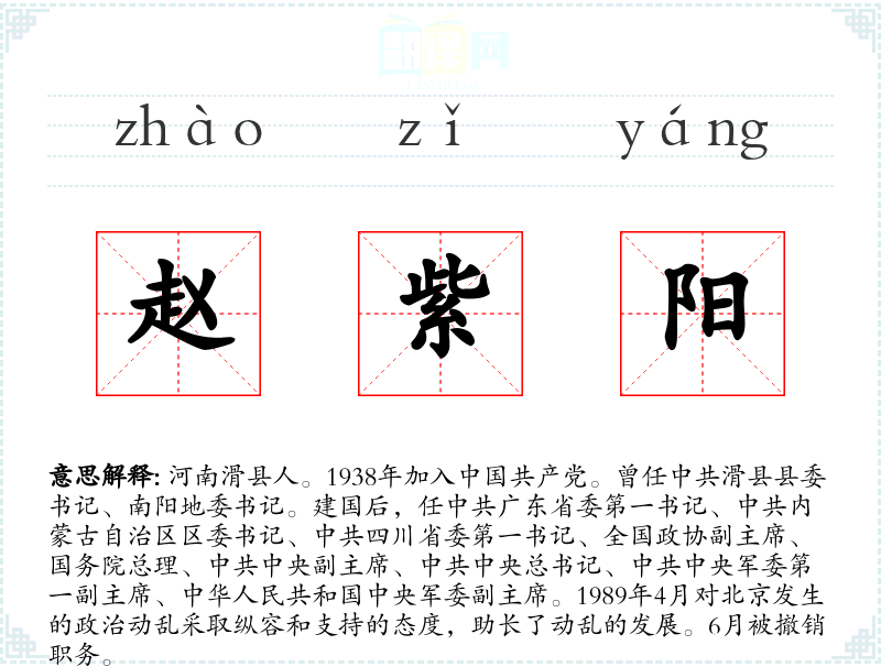 1.河南滑县人。1938年加入中国共产党。曾任中共滑县县委书记、南阳地委书记。建国后,任中共广东省委第一书记、中共内蒙古自治区区委书记、中共四川省委第一书记、全国政协副主席、国务院总理、中共中央副主席、中共中央总书记、中共中央军委第一副主席、中华人民共和国中央军委副主席。1989年4月对北京发生的政治动乱采取纵容和支持的态度,助长了动乱的发展。6月被撤销职务。