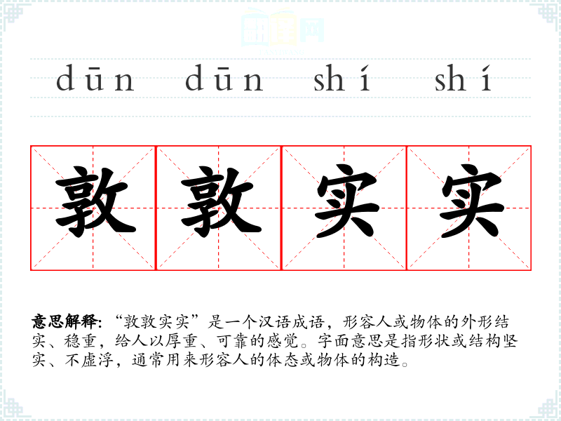 “敦敦实实”是一个汉语成语,形容人或物体的外形结实、稳重,给人以厚重、可靠的感觉。字面意思是指形状或结构坚实、不虚浮,通常用来形容人的体态或物体的构造。