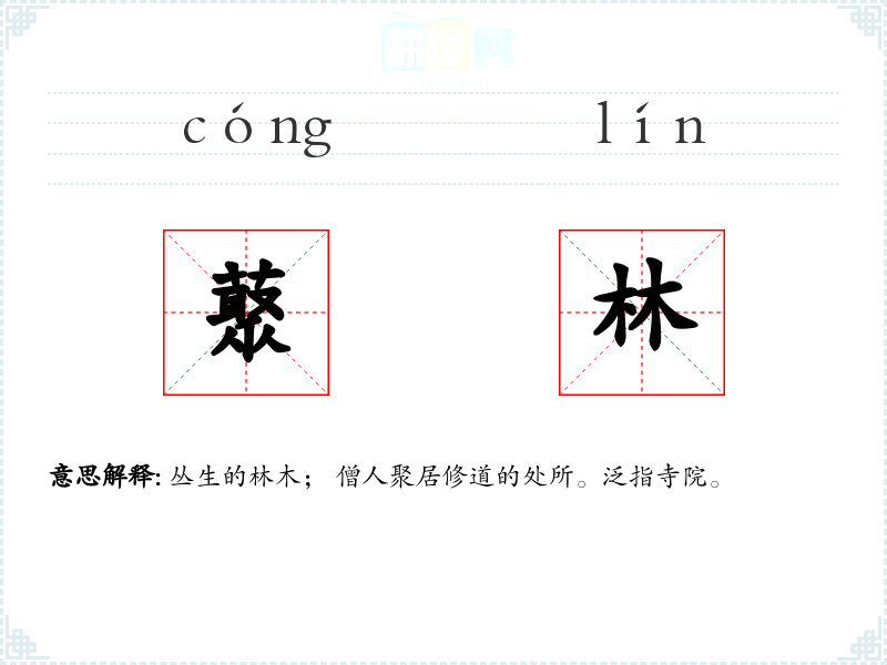 丛生的林木; 僧人聚居修道的处所。泛指寺院。