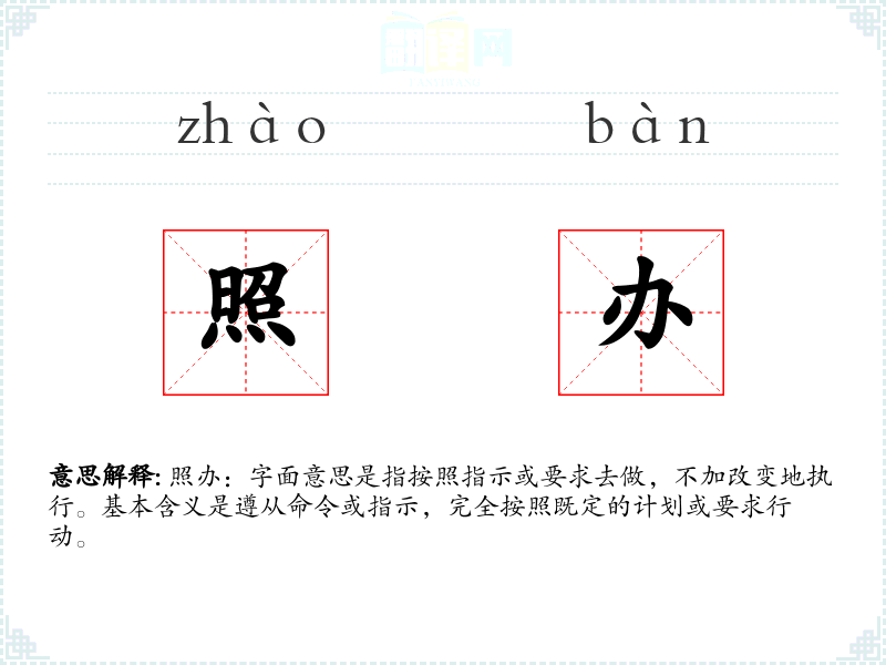 照办:字面意思是指按照指示或要求去做,不加改变地执行。基本含义是遵从命令或指示,完全按照既定的计划或要求行动。
