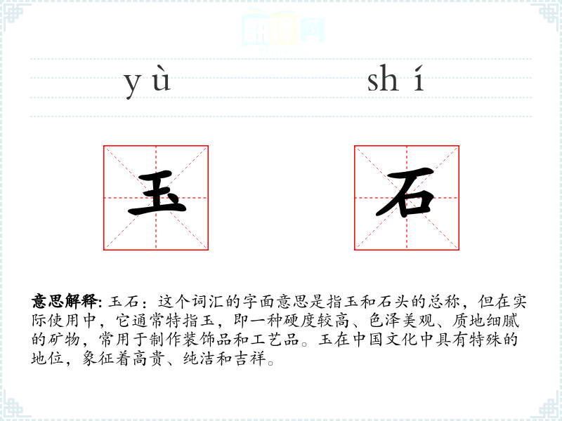 玉石:这个词汇的字面意思是指玉和石头的总称,但在实际使用中,它通常特指玉,即一种硬度较高、色泽美观、质地细腻的矿物,常用于制作装饰品和工艺品。玉在**文化中具有特殊的地位,象征着高贵、纯洁和吉祥。