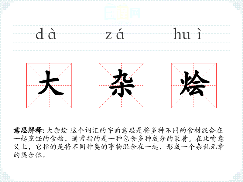 大杂烩 这个词汇的字面意思是将多种不同的食材混合在一起烹饪的食物,通常指的是一种包含多种成分的菜肴。在比喻意义上,它指的是将不同种类的事物混合在一起,形成一个杂乱无章的集合体。