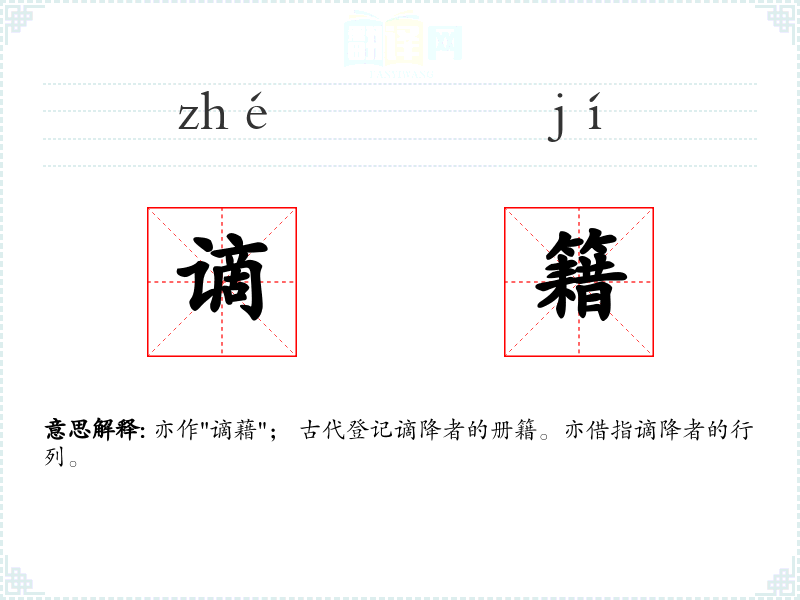 亦作"谪藉"; 古代登记谪降者的册籍。亦借指谪降者的行列。