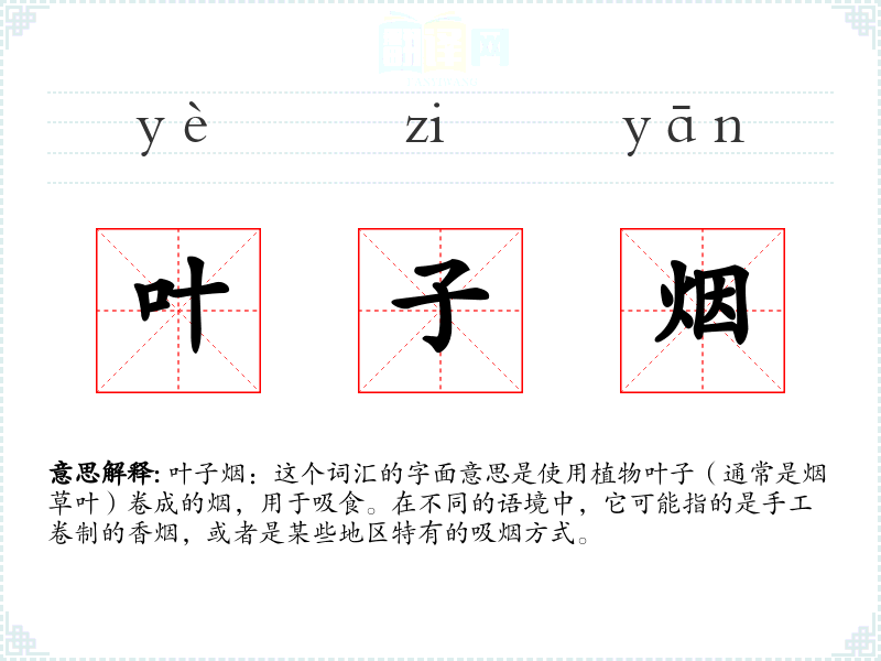 叶子烟:这个词汇的字面意思是使用植物叶子(通常是烟草叶)卷成的烟,用于吸食。在不同的语境中,它可能指的是手工卷制的香烟,或者是某些地区特有的吸烟方式。