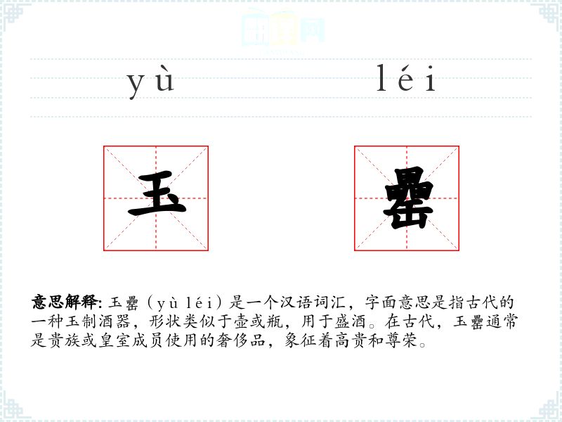 玉罍(yù léi)是一个汉语词汇,字面意思是指古代的一种玉制酒器,形状类似于壶或瓶,用于盛酒。在古代,玉罍通常是贵族或皇室成员使用的奢侈品,象征着高贵和尊荣。