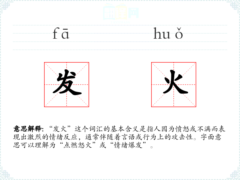 - 口语:在日常口语中,“发火”是一个常用词汇,用来描述某人因为某事而生气。