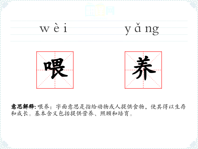 喂养:字面意思是指给动物或人提供食物,使其得以生存和成长。基本含义包括提供营养、照顾和培育。