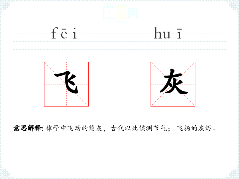 律管中飞动的葭灰,古代以此候测节气; 飞扬的灰烬。