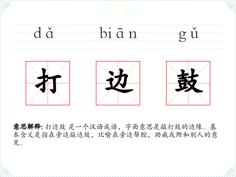 打边鼓 是一个汉语成语,字面意思是敲打鼓的边缘。基本含义是指在旁边敲边鼓,比喻在旁边帮腔,助威或附和别人的意见。