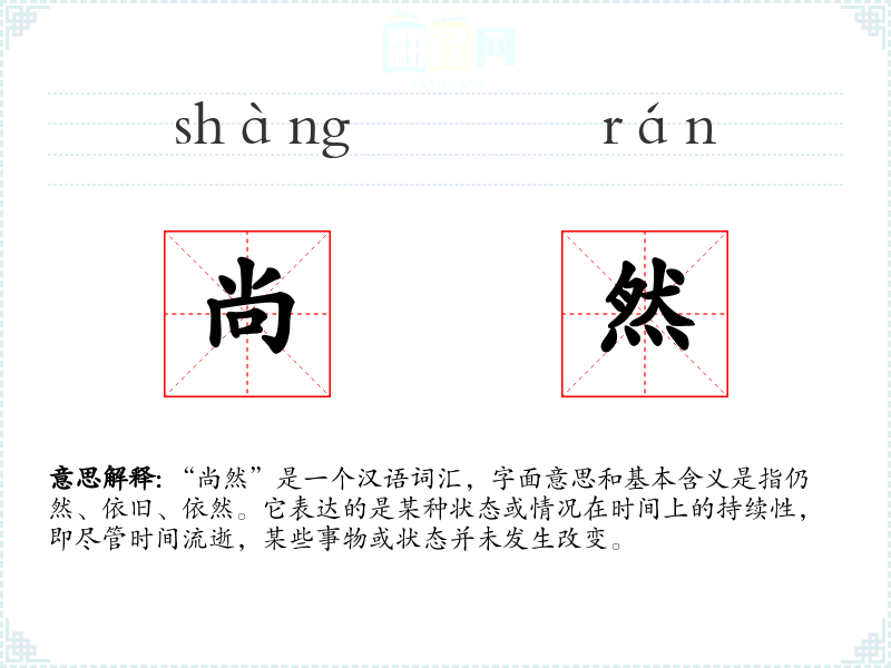 “尚然”是一个汉语词汇,字面意思和基本含义是指仍然、依旧、依然。它表达的是某种状态或情况在时间上的持续性,即尽管时间流逝,某些事物或状态并未发生改变。