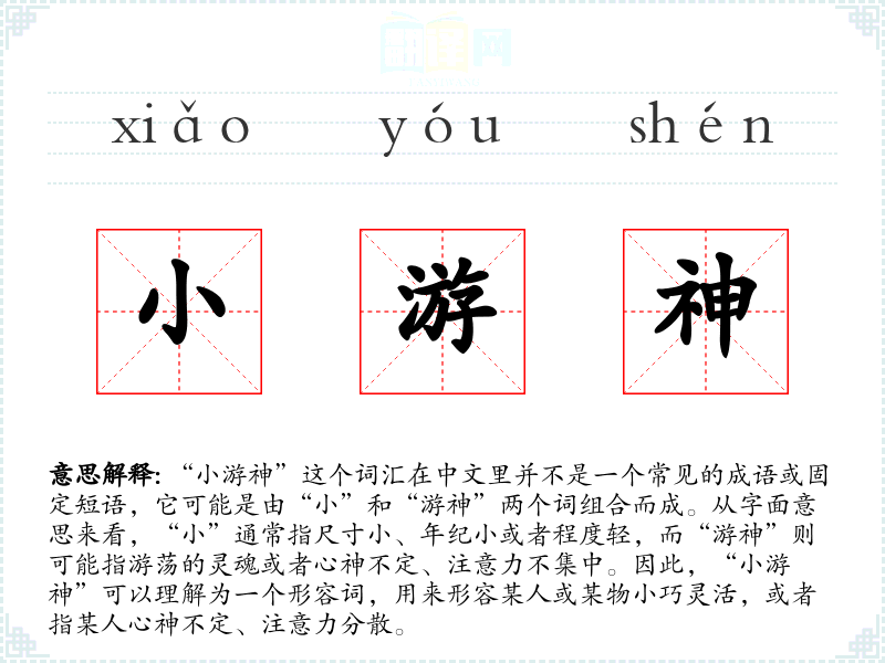 “小游神”这个词汇虽然不是一个标准词汇,但它具有一定的描述性和情感色彩,能够形象地表达出活泼、灵活或心神不定的状态。在语言学习和表达中,了解和掌握这样的词汇可以帮助我们更丰富地表达自己的思想和情感。