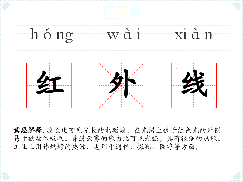 波长比可见光长的电磁波,在光谱上位于红色光的外侧。易于被物体吸收,穿透云雾的能力比可见光强。具有很强的热能,工业上用作烘烤的热源,也用于通信、探测、医疗等方面。