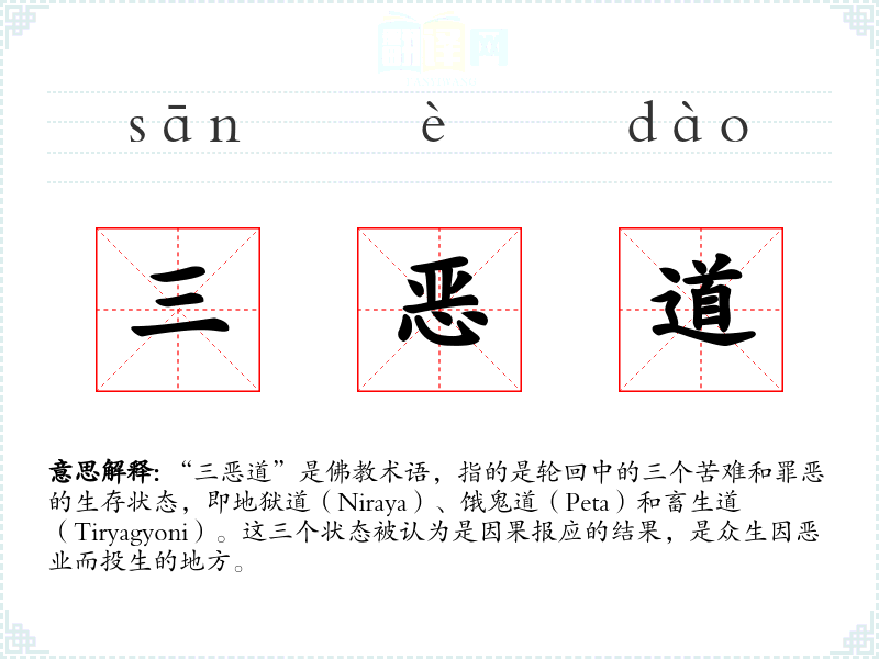 - 反义词:三善道(即天道、人道、阿修罗道,是**中认为的较好的生存状态)
