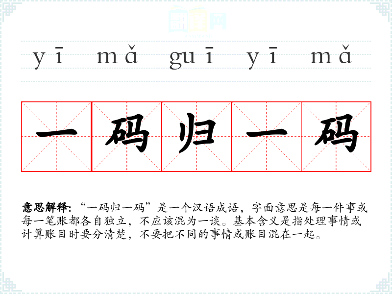 “一码归一码”是一个汉语成语,字面意思是每一件事或每一笔账都各自独立,不应该混为一谈。基本含义是指处理事情或计算账目时要分清楚,不要把不同的事情或账目混在一起。