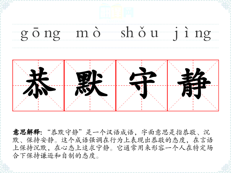 “恭默守静”是一个汉语成语,字面意思是指恭敬、沉默、保持安静。这个成语强调在行为上表现出恭敬的态度,在言语上保持沉默,在心态上追求宁静。它通常用来形容一个人在特定场合下保持谦逊和自制的态度。