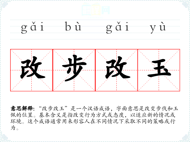 在文学作品中,“改步改玉”常用来描绘人物在面对不同情境时的灵活应变能力。在口语中,这个成语可能不常用,但在某些专业领域,如管理学或心理学,它可能被用来讨论适应性和灵活性的重要性。