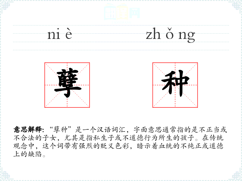 “孽种”是一个汉语词汇,字面意思通常指的是不正当或不合法的子女,尤其是指私生子或不道德行为所生的孩子。在传统观念中,这个词带有强烈的贬义色彩,暗示着血统的不纯正或道德上的缺陷。