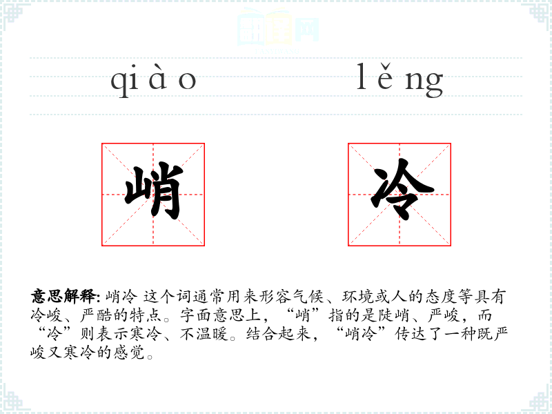“峭冷”这个词在形容自然环境或人的态度时非常有用,它传达了一种强烈的寒冷和严峻感。在学*语言和表达时,掌握这样的词汇可以丰富我们的描述能力,使表达更加生动和精确。