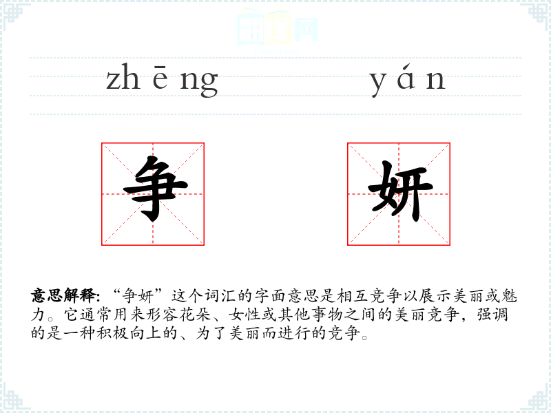 “争妍”这个词汇的字面意思是相互竞争以展示美丽或魅力。它通常用来形容花朵、女性或其他事物之间的美丽竞争,强调的是一种积极向上的、为了美丽而进行的竞争。