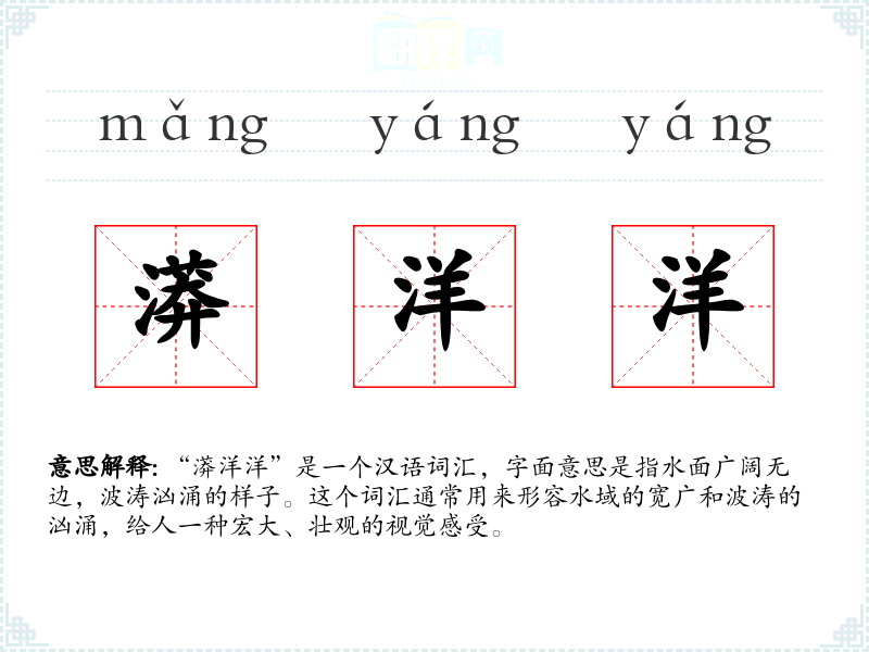 “漭洋洋”是一个汉语词汇,字面意思是指水面广阔无边,波涛汹涌的样子。这个词汇通常用来形容水域的宽广和波涛的汹涌,给人一种宏大、壮观的视觉感受。
