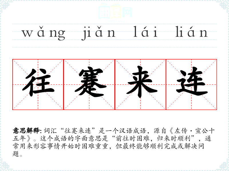“往蹇来连”出自《左传·宣公十五年》,原文是“往蹇来连,君子之交也”,原意是指君子之间的交往,即使开始时困难,最终也会顺利。随着时间的推移,这个成语的含义逐渐扩展,用来形容各种事情的发展过程。