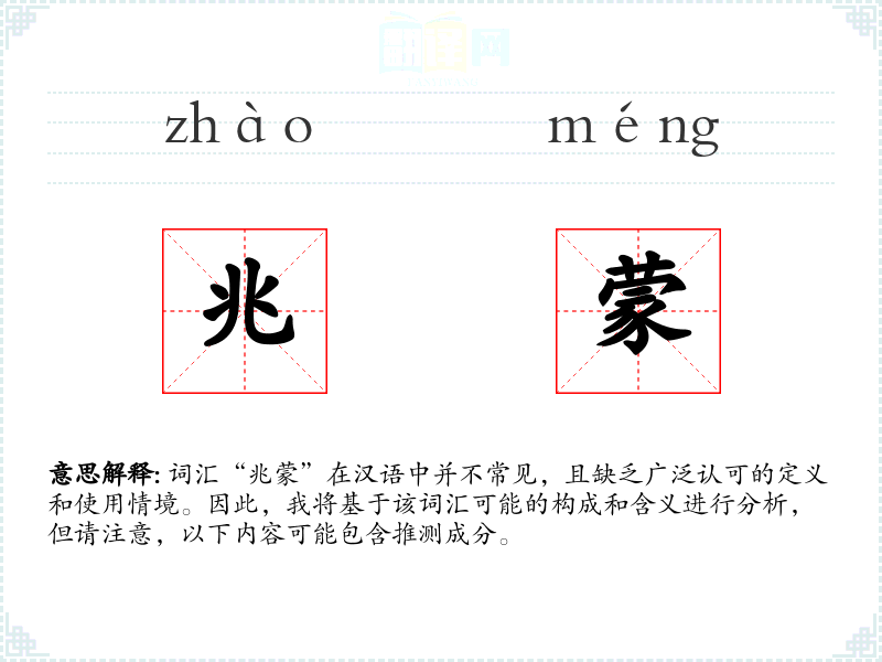 词汇“兆蒙”在汉语中并不常见,且缺乏广泛认可的定义和使用情境。因此,我将基于该词汇可能的构成和含义进行分析,但请注意,以下内容可能包含推测成分。