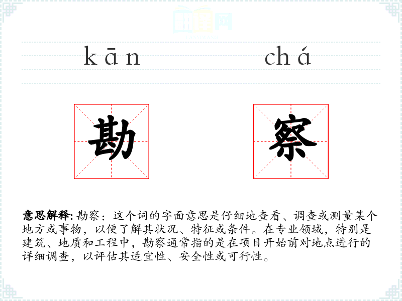 勘察:这个词的字面意思是仔细地查看、调查或测量某个地方或事物,以便了解其状况、特征或条件。在专业领域,特别是建筑、地质和工程中,勘察通常指的是在项目开始前对地点进行的详细调查,以评估其适宜性、安全性或可行性。