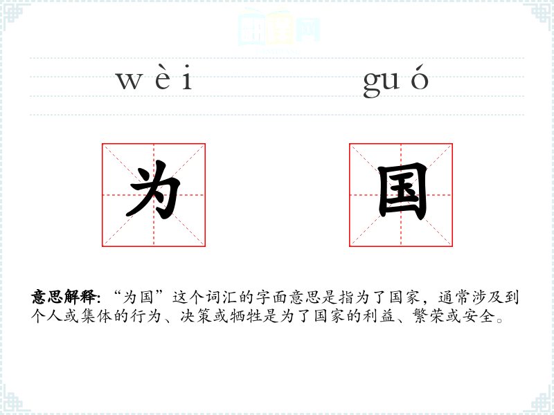 “为国”这个词汇的字面意思是指为了国家,通常涉及到个人或集体的行为、决策或牺牲是为了国家的利益、繁荣或安全。