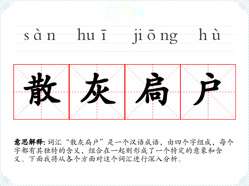 词汇“散灰扃户”是一个汉语成语,由四个字组成,每个字都有其独特的含义,组合在一起则形成了一个特定的意象和含义。下面我将从各个方面对这个词汇进行深入分析。