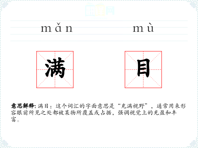 满目:这个词汇的字面意思是“充满视野”,通常用来形容眼前所见之处都被某物所覆盖或占据,强调视觉上的充盈和丰富。