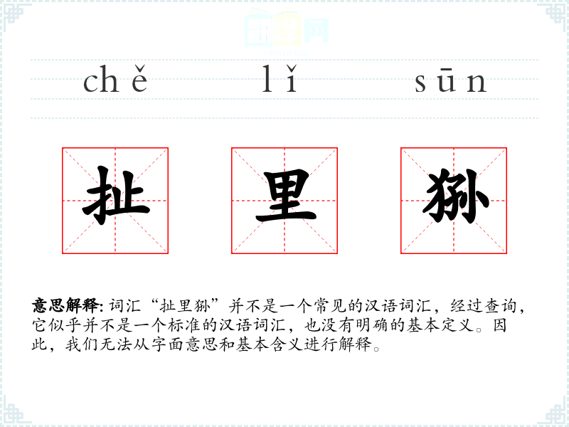 词汇“扯里狲”并不是一个常见的汉语词汇,经过查询,它似乎并不是一个标准的汉语词汇,也没有明确的基本定义。因此,我们无法从字面意思和基本含义进行解释。