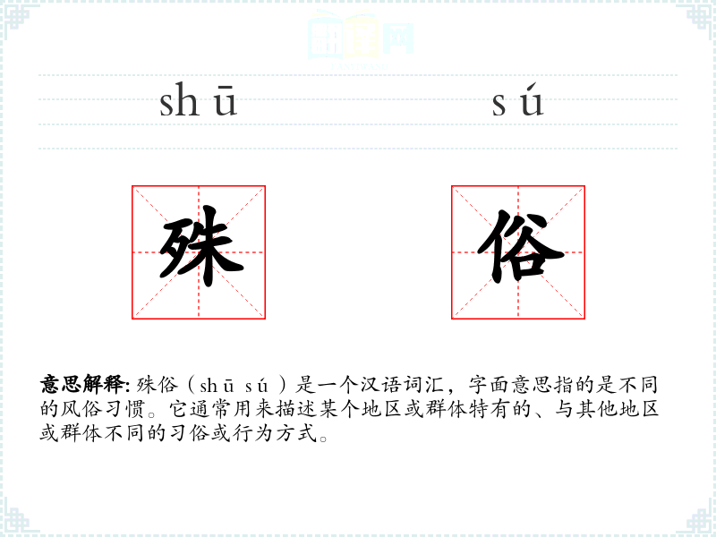 殊俗(shū sú)是一个汉语词汇,字面意思指的是不同的风俗习惯。它通常用来描述某个地区或群体特有的、与其他地区或群体不同的习俗或行为方式。