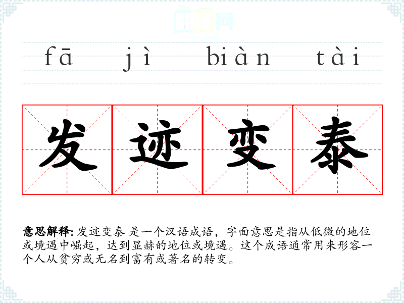 发迹变泰 是一个汉语成语,字面意思是指从低微的地位或境遇中崛起,达到显赫的地位或境遇。这个成语通常用来形容一个人从贫穷或无名到富有或著名的转变。