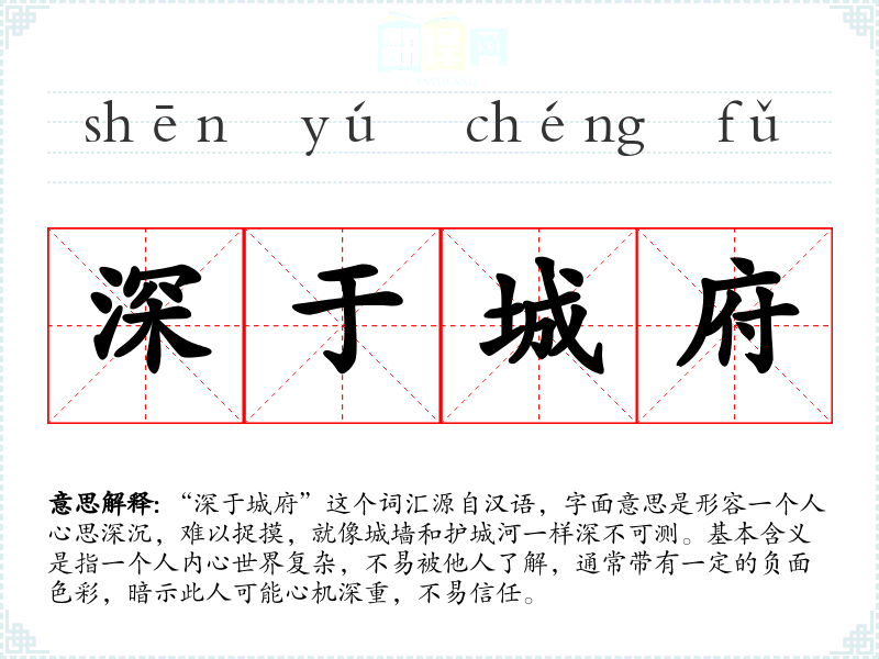 “深于城府”这个词汇源自汉语,字面意思是形容一个人心思深沉,难以捉摸,就像城墙和护城河一样深不可测。基本含义是指一个人内心世界复杂,不易被他人了解,通常带有一定的负面色彩,暗示此人可能心机深重,不易信任。