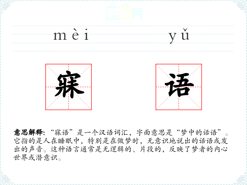“寐语”是一个汉语词汇,字面意思是“梦中的话语”。它指的是人在睡眠中,特别是在做梦时,无意识地说出的话语或发出的声音。这种语言通常是无逻辑的、片段的,反映了梦者的内心世界或潜意识。
