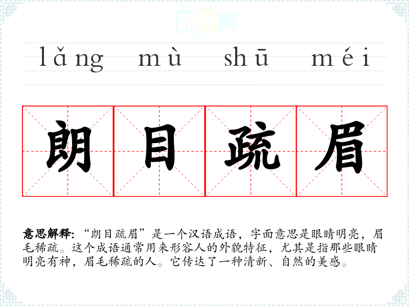在英语中,可能没有一个完全对应的成语,但可以用“bright eyes and sparse eyebrows”来大致表达相同的意思。不同文化对于美的标准和表达方式有所不同,但“朗目疏眉”所传达的自然和谐的美感是普遍受人喜爱的。