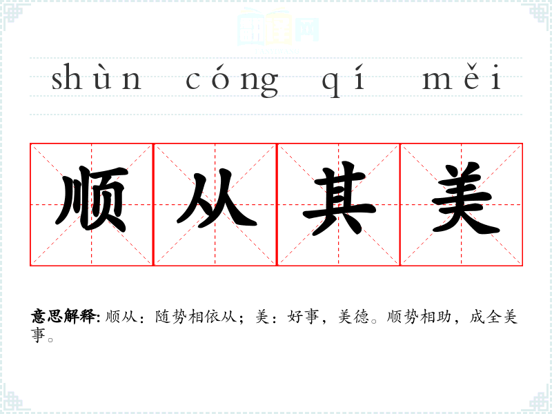 顺从:随势相依从;美:好事,美德。顺势相助,成全美事。