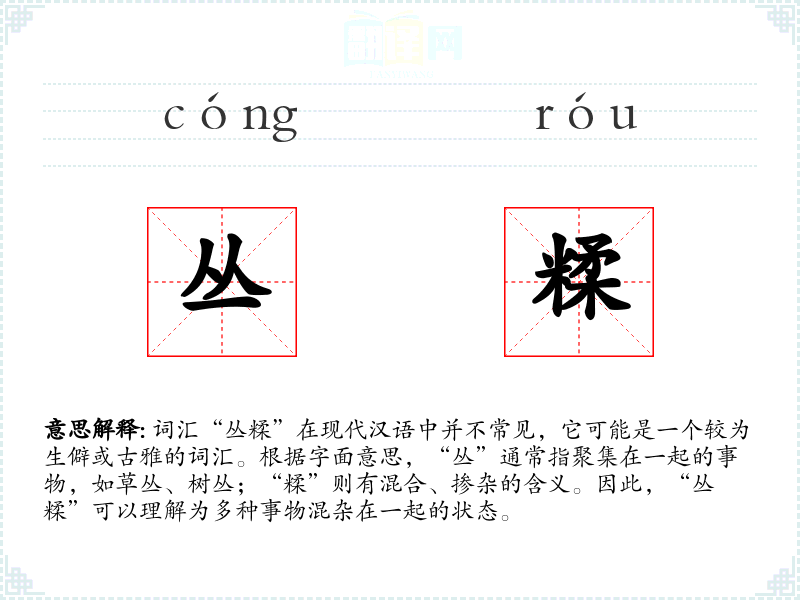 - 理解:“丛糅”是一个形容复杂、混杂状态的词汇,虽然在日常语言中不常见,但在文学和某些专业领域中仍有其独特的表达效果。