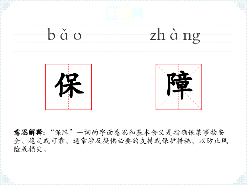 在特定的文化或社会背景中,“保障”常与安全、稳定和信任等概念相关联。例如,在社会保障体系中,“保障”用于描述政府对公民基本生活需求的保护。