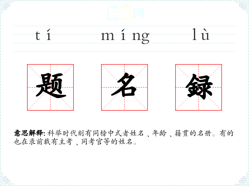 科举时代刻有同榜中式者姓名﹑年龄﹑籍贯的名册。有的也在录前载有主考﹑同考官等的姓名。