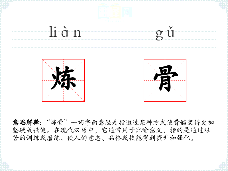 “炼骨”一词字面意思是指通过某种方式使骨骼变得更加坚硬或强健。在现代汉语中,它通常用于比喻意义,指的是通过艰苦的训练或磨练,使人的意志、品格或技能得到提升和强化。