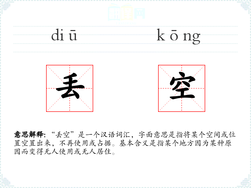 “丢空”是一个汉语词汇,字面意思是指将某个空间或位置空置出来,不再使用或占据。基本含义是指某个地方因为某种原因而变得无人使用或无人居住。
