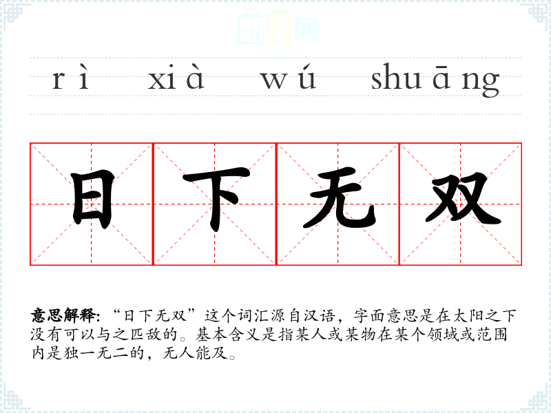 “日下无双”这个词汇源自汉语,字面意思是在太阳之下没有可以与之匹敌的。基本含义是指某人或某物在某个领域或范围内是独一无二的,无人能及。
